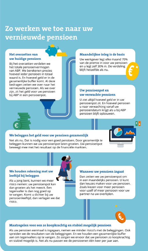 Bij de overgang naar jouw vernieuwde pensioenregeling blijft veel hetzelfde. Pensioen blijft een waardevolle arbeidsvoorwaarde. Mee- en tegenvallers deelt ABP samen met jou. En jij krijgt pensioen zolang je leeft. Zelfs als je 120 jaar oud wordt. Maar er verandert ook het een en ander.